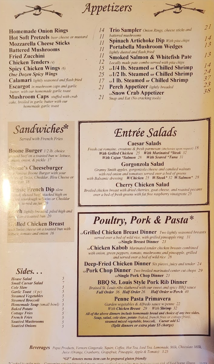 Boone's menu suits a range of occasions—from casual family dinners to more special gatherings on the deck, where the atmosphere is comfortably lively. Alongside the robust main courses, there's an array of appetizers like calamari and crab dip that encourage sharing and relaxed conversation. For those who enjoy pairing their meal with a drink, simple wine choices and classic cocktails, such as martinis, complement the culinary offerings without overwhelming them.